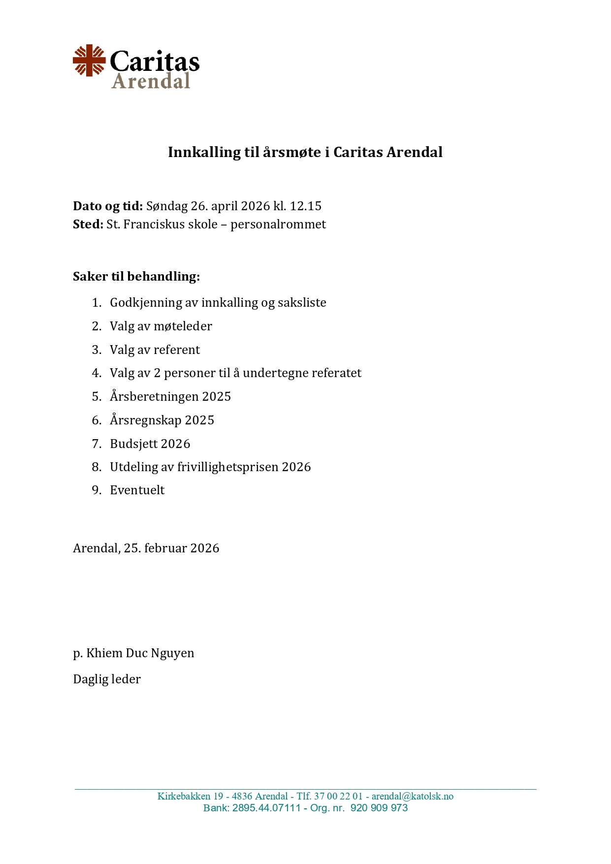 Innkalling til årsmøte i Caritas Arendal